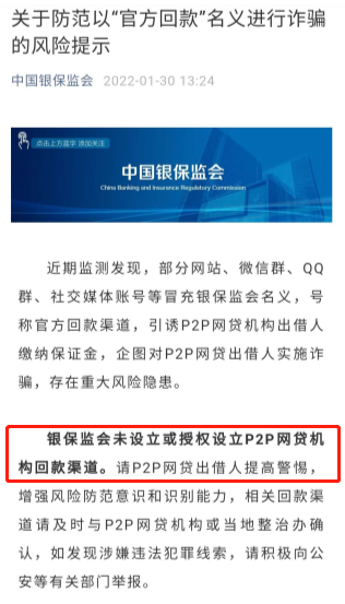 针对此类骗局,1月30日,银保监会官方微信公众号发布《关于防范以“官方回款”名义进行诈骗的风险提示》,落款为网络借贷风险专项整治办公室。同时,在银保监会官网,该提示也以弹窗形式出现。