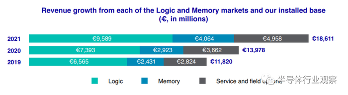 2019-2021年ASML来自逻辑和内存市场以及安装基础的营收数据(单位:百万欧元)