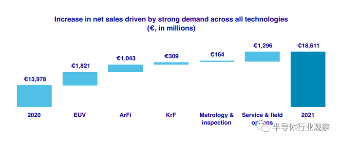 净销售额的增长是由ASML所有技术的强劲需求推动的。ASML在2021年成功出货了42套EUV系统,包括26台用于大批量生产的第一个NXE:3600D。这使得EUV系统在2021年的收入达到63亿欧元,比2020年增加了18亿欧元。