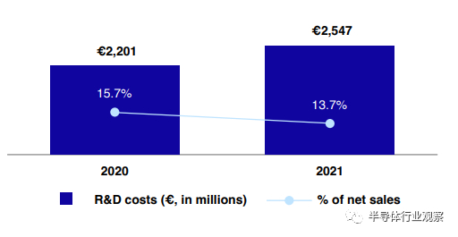 在研发投入方面,2021年ASML的研发成本为25.47亿欧元,相较于2020年22.08亿欧元的投入,这些增加的投资涉及整体光刻解决方案的EUV、DUV和应用程序项目,其中最重要的投资用于继续加强EUV大批量生产的路线图,以及EUV 0.55 NA的开发。