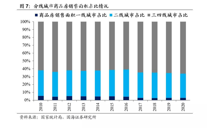 2014年以来,棚改货币化撬动了三四线城市的房地产市场。2020年,三四线房地产市场销售面积占全国的66%。