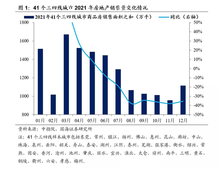 2021年,东莞、常州等41个三四线样本城市的全年商品房销售总面积达到1.5亿平方米,同比下降5%,且销售均价同比增速走势和销售总面积维持一致,即2021年1-5月份同比增速均超过10%,之后回落至个位数,但销售均价同比增速仍维持正增长。