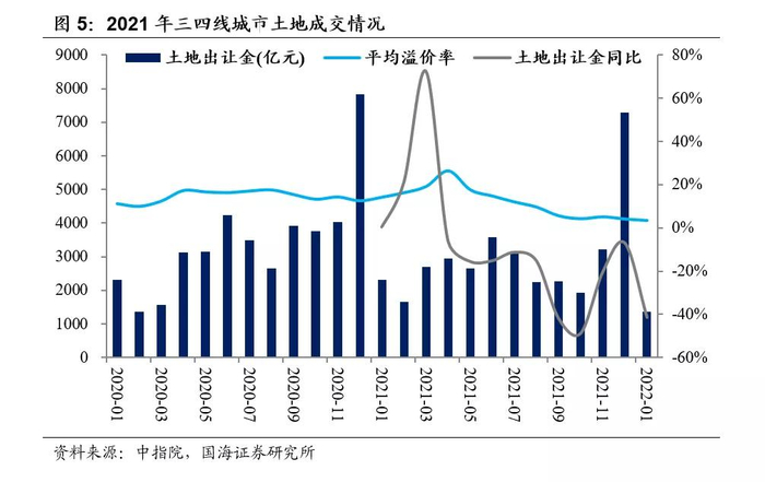 2022年1月,三四线城市的土地市场表现持续下行,土地出让收入同比下降41.4%,溢价率降至3.4%。项目去化难度加大,房企拿地热情不高。