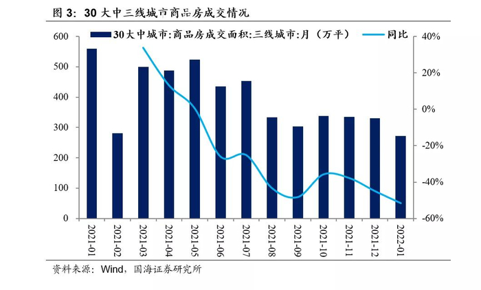 2022年开年,三四线城市的商品房成交持续下滑。Wind数据显示,2022年1月,30大中三线城市的商品房成交面积为271.4万平方米,同比下降51.5%;除夕到大年初五成交面积为2.1万平方米,与2021年同期相比下滑57.1%,下滑态势较为严重。