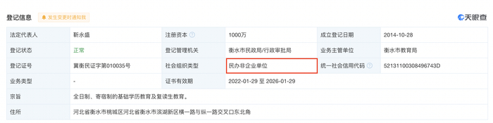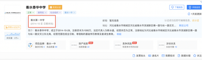 2月14日,时代周报记者通过天眼查发现,衡水一中已更名为“衡水泰华中学”,社会组织类型显示为“民办非企业单位”。