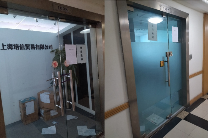 第二天,记者再度前往培信贸易及歆屹贸易探访,发现两家公司均大门紧锁、无人办公了(图5)。