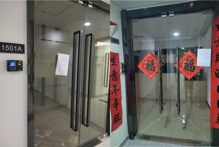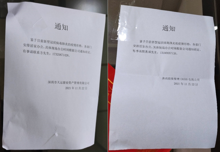 两家公司的大门玻璃上,分别贴了一张通知,上面写着完全一致的内容:鉴于目前新型冠状病毒肺炎的疫情形势,各部门安排居家办公,具体现场办公时间根据公司通知而定。落款时间同为2021年11月22日(图3)。记者看到,两家公司的左右邻居都在正常办公,其时,深圳也未出现疫情。