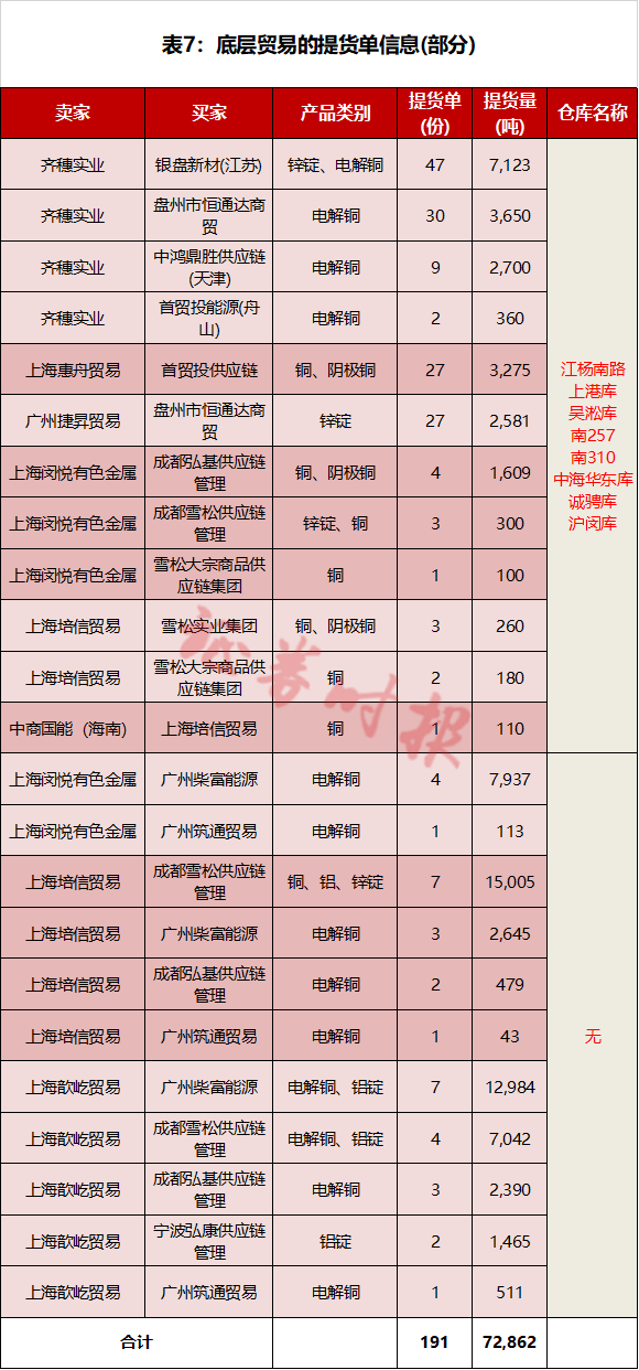 记者对底层贸易资料中的提货单信息进行了统计,提货单数量共计191份,涉及上游卖家7家、下游买家11家,所交易的铜、铝、锌等大宗商品共计7.29万吨(表7)。