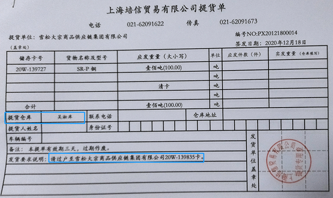 比如,上海培信贸易2020年12月18日出具的一份提货单显示,将该公司在吴淞库储存卡号为“20W-139727”的100吨SR-P铜,过户至雪松大宗商品供应链集团“20W-139835”储存卡(图13)。