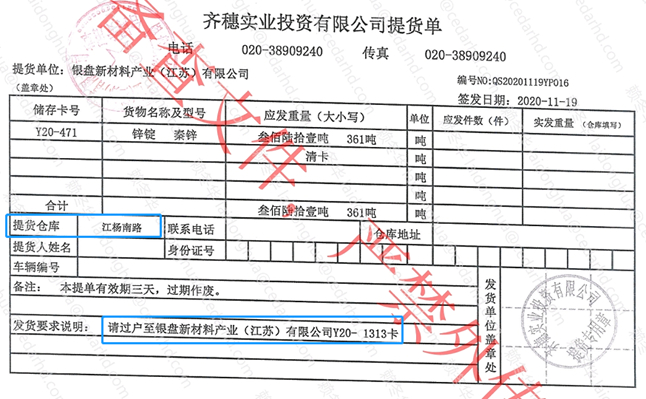 再比如,齐穗实业2020年11月19日出具的一份提货单显示,将该公司在江杨南路仓库储存卡号为“Y20-471”的361吨锌锭,过户至银盘新材料“Y20-1313”储存卡(图14)。