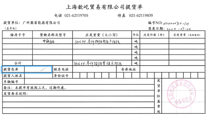 从提货单呈现的信息来看,除了仓库内的相互过户之外,有些交易行为甚至仓库信息都没有。比如,上海歆屹贸易2020年7月20日签发的一份提货单,提货单位为广州柴富能源(雪松下属公司),所提货物为3806.44吨电解铜;该提货单上仓库信息是缺失的,储存卡号也是缺失的(图15)。