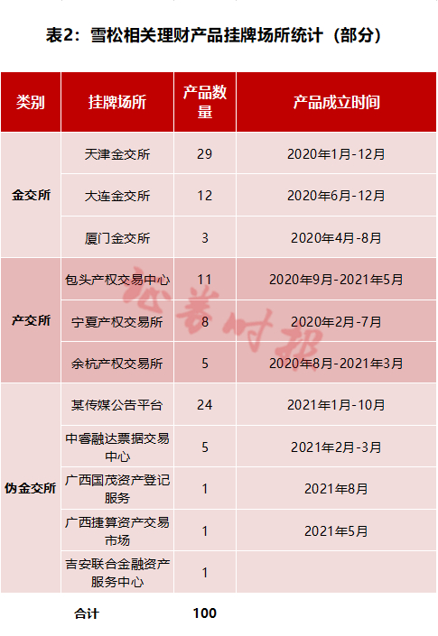 记者把这100份产品文件汇总统计发现,这100只产品共计涉及11个挂牌场所,包括金交所、产交所、伪金交所三大类(表2)。其中,大连金交所系雪松自身控股的金交所。