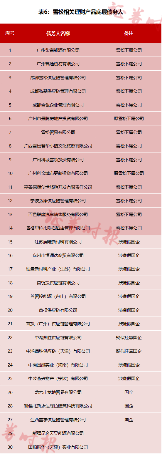 正是这些雪松体系内的公司与体外的众多假国企,成为了351只理财产品、至少200亿元规模底层资产的债务人。如今,理财产品全面逾期,既不见融资人还款,也不见债务人回款。