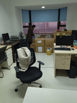 记者与投资人先来到10楼1008室的培信贸易,办公区面积大约40平米,内有4人在办公,现场凌乱地堆放着大量贸易单据(图4)。