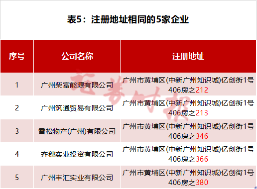 齐穗实业的注册地址为“广州市黄埔区(中新广州知识城)亿创街1号406房之366”,记者注意到,包含齐穗实业在内,相关理财产品涉及的企业中,有5家公司注册于此(表5)。其中,前三家——柴富能源、筑通贸易、雪松物产,皆为雪松控股下属公司。