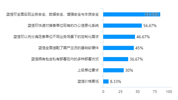 据本次调研统计结果显示,针对“您认为,贵单位选择使用蓝信的原因是什么?”这一问题, 83.33%的用户选择了“蓝信可全面实现业务安全、数据安全、增强安全与本质安全”;56.67%的用户选择了“蓝信可快速对接贵单位现有的办公信息化系统”。这两大核心原因,正是对于蓝信“安全有界,协同无界”品牌理念的最佳诠释。