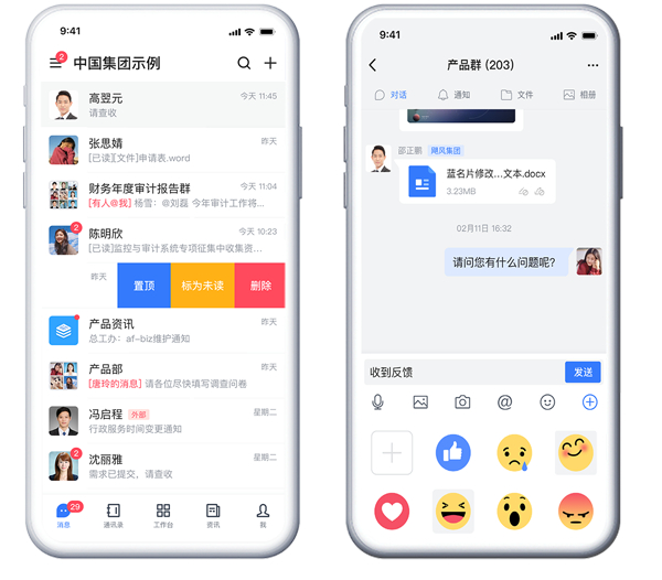 消息传达效果一目了然:私聊、群聊消息支持原文回复、查看已读未读,并可一键@未读成员;如有不能及时处理的已读私聊会话,可重新标记为未读,作为备忘,后续跟进处理。