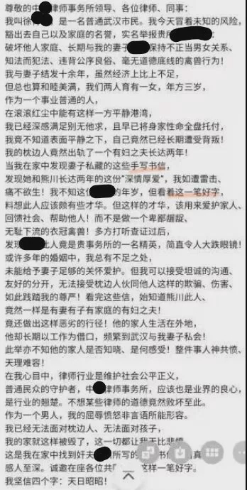 近日,中伦律所的很多领导员工突然收到热心市民徐先生群发的邮件。该邮件实名举报律所的权益合伙人熊某,出轨自己的妻子长达两年,并将熊某给其妻手写的部分书信作为证据公之于众。