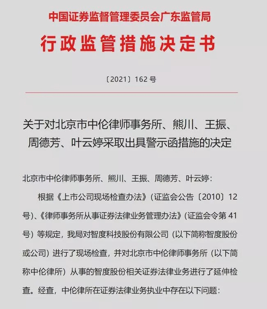 2021年12月,广东证监局公开的一份警示函显示,广东证监局对中伦律所从事的智度股份相关证券法律业务进行了延伸检查。经查,中伦律所在证券法律业务执业中存在两大问题:出具的法律意见书内容与事实不符;未勤勉尽责审慎履行核查和验证义务。上述行为违反了证监会相关规定。