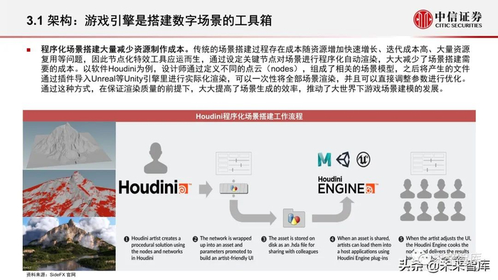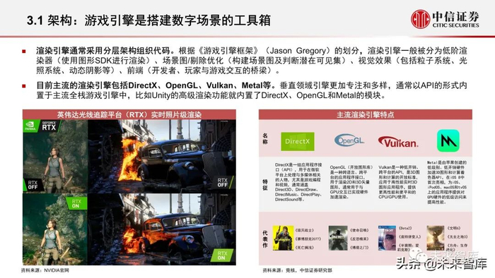 数字场景建设可以类比为在元宇宙中的“基建施工”。元宇宙作为互联网的下一种形态,发展路径一方面可以由实向虚,作为物理世界 的复现和增强渲染,另一方面又可以由虚向实,通过元宇宙与现实世界的交互达到数实结合的全新阶段,而两种路径都需要打造与物理 世界相平行的虚拟场景,作为元宇宙的具象空间和内容承载。数字场景建设构建起元宇宙的基础空间和设施,相当于元宇宙空间中的 “基建施工”,而参与数字场景建设的相关公司相当于元宇宙“施工队”,其中算力是基本生产力,游戏引擎是增进效果和效率的工具 箱,数字创意是施工的图纸,构成了数字场景建设的三大核心要素。(报告来源:未来智库)