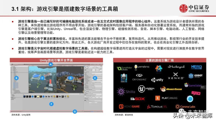 游戏引擎是元宇宙时代搭建虚拟数字场景的工具箱。在构建超级数字场景进而打造元宇宙的过程中,需要对现实进行测度并在数字世界 重绘、统筹声音画面场景等资源,游戏引擎是最贴近这一能力的工具。