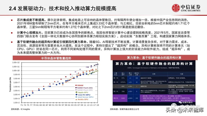 现阶段算力规模主要包括基础算力、智能算力和超算算力三部分。目前的算力主要应用于通用计算、人工智能和科学工程领域,对于芯 片硬件和算力水平的要求有所不同,网络环境和算力投入为算力发展提供坚实保障,而消费和行业具体应用与算力规模相互促进。