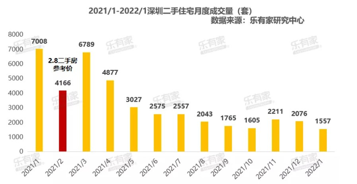 乐有家研究中心数据显示,2021年深圳二手住宅成交量大幅下跌,由2020年的95273套,跌至40699套,同比下降57%。二手住宅成交量占比创15年新低。