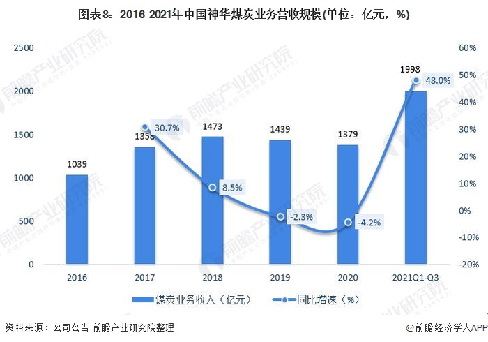 2016-2020年,中国神华的煤炭业务收入呈逐年上升趋势,2020年,中国神华煤炭业务收入缩减至1379亿元,同比下降4.2%,主要由于疫情期间,煤炭贸易暂时停摆,复工复产后国际形势亦出现变化,不利于煤炭进出口,业务受限。2021年前三季度,中国神华煤炭业务收入达到1998亿元,同比上升48.0%。中国神华的业务拓展速度加快,市占率有序提升。