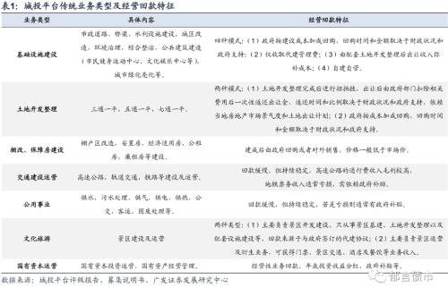 其次看公司所从事的业务,是否是帮助地方政府完成某项职能。城投平台传统业务类型一般可以划分为基础设施建设、土地开发整理、棚改、交通建设运营、公用事业、文化旅游和国有资本运营7大类,具体特点见表1。目前城投平台转型是大势所趋,中央和地方都不断出台政策要求平台加快转型。因此,除了传统的城投业务外,平台所从事的经营性业务越来越多,主要包括房地产、建筑施工、商品销售(贸易)、金融和产业投资等。部分平台还通过直接收购上市公司,拓展经营性业务,行业种类多样。