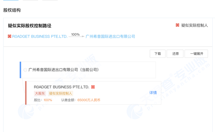 广州希音国际进出口有限公司的母公司已经变更为Roadget Business Pte. LTD.