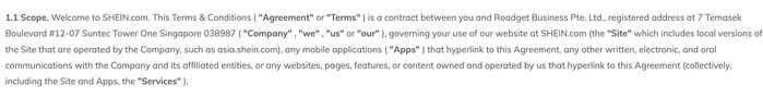 Shein在官网上标明其运营主体为Roadget Business Pte. LTD.