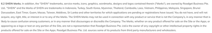 Shein在官网上标明其商标知识产权属于Roadget Business Pte. LTD.