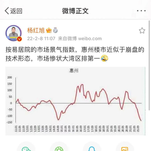 而这几天,易居研究院一张关于惠州楼市市场景气度近10年最差的折线图在网上盛传,易居研究院院长杨红旭甚至直言惠州楼市技术形态近似崩盘,市场惨状大湾区排第一。