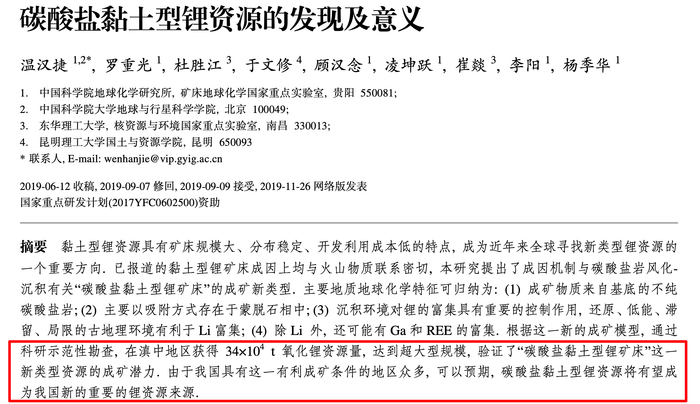 滇中锂矿发现的意义还不止于云南玉溪一地。据中国科学院、东华理工大学、昆明理工大学联合研究团队2019年底发表的论文指出,滇中锂矿验证了“碳酸盐黏土型锂矿床”这一新类型资源的成矿潜力,而我国具有这一有利成矿条件的地区众多,因此有望成为我国新的重要的锂资源来源。