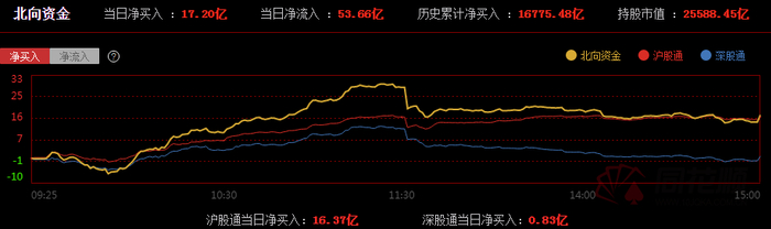4、北向资金方面,沪股通全天净买入16.37亿,深股通全天净买入0.83亿,合计净买入17.2亿元。