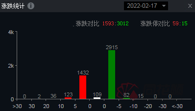 3、两市共1593只个股上涨,3012只个股下跌;涨停59家,跌停15家。