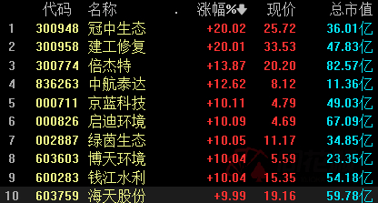 环保概念板块涨幅居前,开盘后即持续拉升,板块中冠中生态(300948)、建工修复(300958)20CM涨停,卓锦股份、倍杰特、中航泰达、涨幅居前。