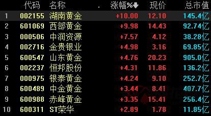 受消息刺激,午后开盘,黄金板块直线拉起,一跃成为两市涨幅榜第一的板块,个股上,湖南黄金(002155)、西部黄金(601069)涨停,中润资源(000506)、金贵银业(002716)跟涨。