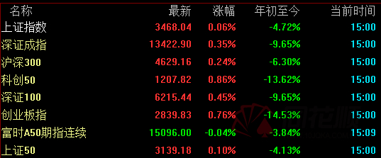 2、截止收盘,沪指涨0.06%,深成指涨0.35%,创业板指涨0.76%;