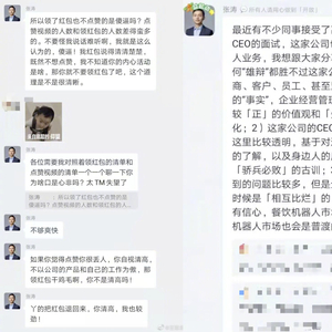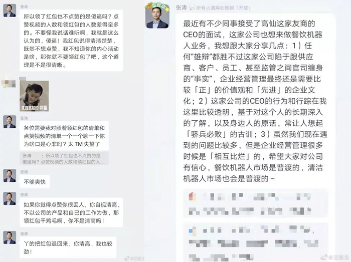 该群聊截图显示,普渡科技CEO张涛在群内发布产品宣传视频,随后附上红包。因有员工领红包后并未给视频点赞,张涛在群内怒骂员工,并要求不点赞的人将红包退回。除此外,张涛也在群内发表了对友商的贬损言论。