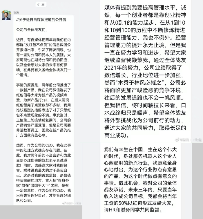 张涛还表示,未来三年内,只要当年收入达成公司目标,会将本人当年工资50%以红包形式发放给员工。