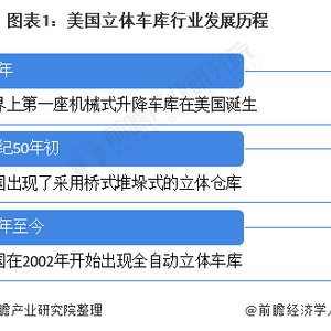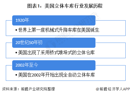 在1920年世界上第一座机械式升降车库在美国诞生,但技术并不完善,车辆的存取仍需司机自行完成。20世纪50年初,美国出现了采用桥式堆垛式的立体仓库,并逐步发展成为计算机控制的自动化立体停车库。随着汽车工业的迅猛发展,在60年代后期,城市内汽车数量大幅增加,立体停车位也得到了飞速发展。在互联网和人工智能高速发展的背景下,立体车库智能化产品也逐渐出现在大众的眼前,作为全球科技最为发达的国家之一,美国在2002年开始出现全自动立体车库。