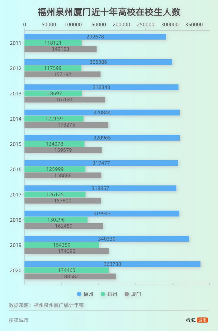 年鉴显示,2020年,福建区域范围内有高校89所(其中福州34所、泉州18所、厦门16所),在校人数近95万人——在东部南部沿海省份中是最少的。无论在数量还是在质量上,福建高等教育不具备突出优势,在创新能力、核心竞争力等方面偏弱。就福厦泉三地来说,厦门高等教育拔尖,福州高校数量最多,泉州整体偏弱。