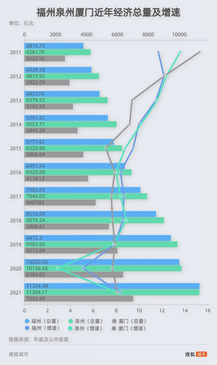 2021年福州GDP总量11324亿元,新世纪以来经济总量首次超过泉州,成为全省第一。“2021福建企业100强”名单显示,福州45家企业上榜,在数量上占据绝对优势——这是强省会的重要支撑。厦门29家企业上榜,值得注意的是,前三强都来自厦门。泉州只有9家企业上榜,是福州的五分之一,企业规模方面与经济实力不匹配。