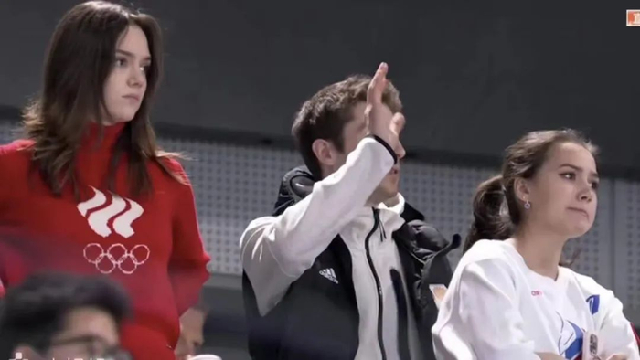 2022北京冬奥会女单短节目时,观众席上的扎吉托娃和梅德韦杰娃