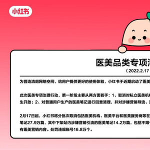 小红书医美品类专项治理启动以来,首批共处置违规笔记27.9万篇,其中下架站内涉嫌营销引流的医美笔记14.2万篇,包括不限于涉及违规医美项目、医美机构、整形外科医生、医美产品等所有医美营销内容。同时,处罚违规账号16.8万个。