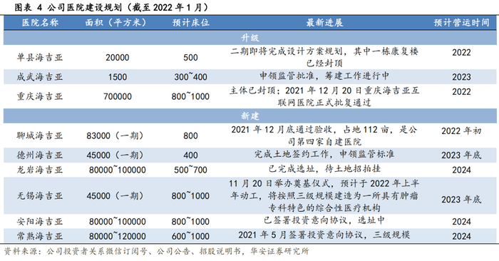 自建层面,公司在2021Q3曾在调研中提到,集团整体的动态床位使用率控制在75-80%,如果超过80%就会规划新建筑并增加新床位,目前正建二期的旗下医院(单县、成武、重庆)公司均透露过床位利用率近满负荷。从公司披露的数据看,预计至2023年底,公司运营的全部医院的床位数将达到一万张左右,较当前床位数增加约3.6倍。