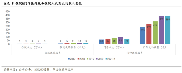截至2020年底,公司医院共有住院人次66429人,次均收入13098元,同比增加14%;住院医疗服务收入8.7亿元,占公司2020年全年营收62.05%。