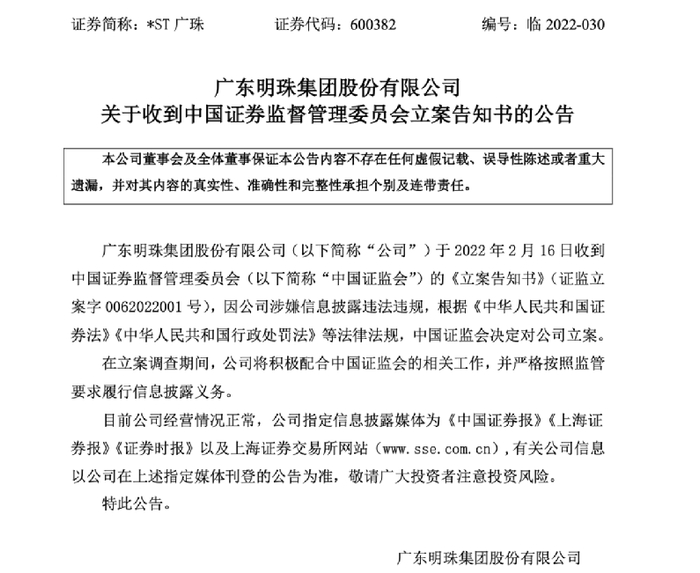 2月16日晚间,*ST广珠发布公告称,公司收到中国证券监督管理委员会(以下简称“中国证监会”)的《立案告知书》(证监立案字0062022001号),因公司涉嫌信息披露违法违规,根据《中华人民共和国证券法》《中华人民共和国行政处罚法》等法律法规,中国证监会决定对公司立案。
