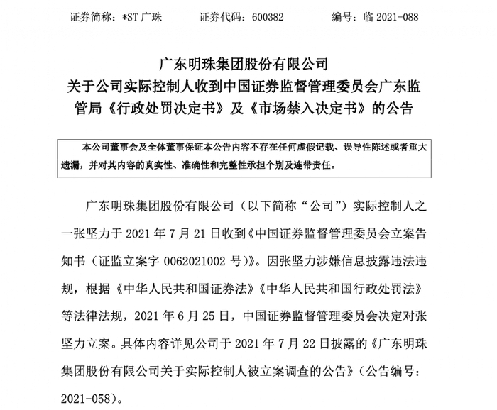 值得注意的是,就在去年12月23日,*ST广珠实际控制人之一张坚力收到广东证监局《行政处罚决定书》及《市场禁入决定书》。